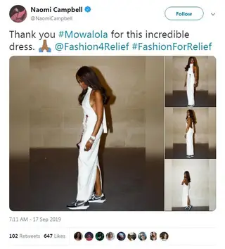 Naomi Campbell causou polémica ao surgir na semana da moda com um vestido branco que simulava que tinha levado um tiro na barriga. A criação de Mowalola foi vista como um desrepeito às vítimas de crimes com armas de fogo e foram várias as pessoas que se mostraram chocadas com a escolha da supermodelo.